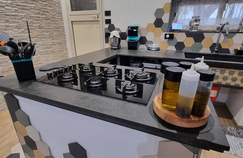 Equipped with every comfort, from the handmade lava stone kitchen to the wood-burning oven that serves as a fireplace in winter.