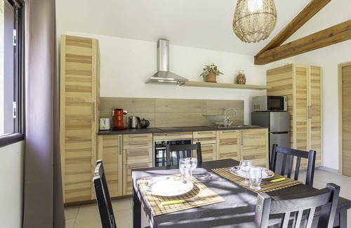 The open kitchen is spacious, with 2 induction hobs, an oven, dishwasher, refrigerator, coffee maker, kettle, and toaster. A table for 4 people allows you to dine inside.
