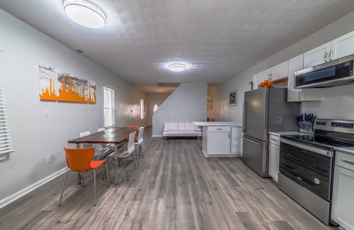 As you walk through the front door, you're greeted by a comfortable living space with a large tv for all of your entertainment needs. Continue into the kitchen, which boasts brand-new appliances, marble countertops, and the perfect dining table for your group. A downstairs full bath and laundry room completes the space.