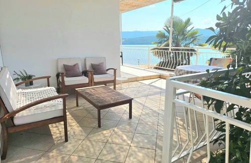 A beachfront property, fully air conditioned with 4 large sea-view terraces, free private parking, and free access to 2 WIFI connections. The villa offers access to 3 bedrooms, each with a separate terrace with an unobstructed sea-view along with 2 bathrooms, an additional toilette, a fully equipped kitchen, and separate large dining and living areas. The villa is surrounded by orange, olive, and lemon trees and abundant with a wide variety of fruits and flowers. The beach is equipped with lounge chairs for 7 persons and provides a shade via covered area as well as olive trees. Use of a small fishing boat can be arranged upon request.