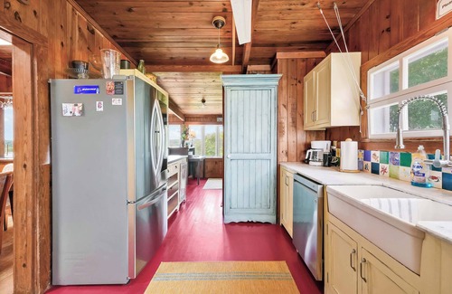Experience a home of enduring warmth and beauty. Built in 1945, on the highest hill for miles around, knotty pine walls and oak floors glow with eight decades of family fun. Screened porch facing the ocean awaits you; private boardwalk carries you to the beach; lookout tower boasts 360-degree views; stairs descend through virgin maritime forest to your private dock. An exquisite property we are lucky to share with you. Small wonder guests return and return!