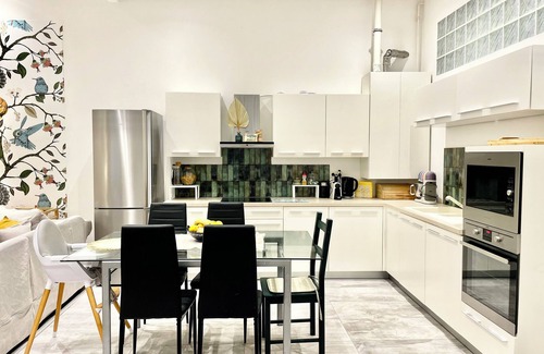 This brilliant apartment offers a terrific living room with 1 queen bed and 1 sofa bed, along with 1 queen bed, 2 twin beds, and 1 crib in the bedrooms. The large bathroom features a bathtub, shower bidet, and hair dryer for your convenience. Guests can also enjoy amenities like WiFi, AC, and a room with fitness accessories during their stay. The kitchen is exceptionally well equipped. Everything was made to here with love and passion for ourselves and our future guests.