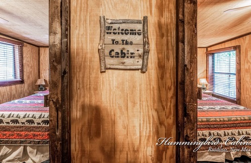 "Our Den" is your perfect getaway from life's fast-paced, hectic schedule. Nestled just outside the Lincoln National Forest, Our Den was created to be a respite where you will find everything you need to just stay in the cozy, inviting cabin enjoying all of the well appointed essentials. There are also plenty of hiking trails nearby! It also features a huge outdoor deck living room – completely covered, with gorgeous views and sounds of nature, a gas grill and cozy furniture. Upon entering the beautiful cabin, you are welcomed into the living room featuring a wood-burning fireplace, cozy couch and oversize chair perfect for relaxing by the fire. Adjacent to the dining area is a cozy sitting room with an adorable, rustic wood-burning stove. This is the perfect space for enjoying a family movie on the flat screen TV, conveniently located inside the armoire, or for relaxing at the end of your day. As an extra little perk we've set up a small sun room, surrounded by windows, with a perfect chair- the ideal spot for reading or enjoying a quiet cup of morning coffee. Downstairs, you will find a fully equipped kitchen complete with all you will need to bake, cook and even make homemade waffles. We love to cook and you can rest assured that this kitchen has everything you need! There are two bedrooms downstairs – each features a cozy queen bed, adorable rustic décor and an armoire for all of your storage needs. There is a full bathroom downstairs featuring a walk-in shower. As you walk up the stairs you will discover the most magnificent master suite. With floor-to-ceiling windows, the natural light and views from the king sized bed are amazing. You will also LOVE the wood-burning fireplace in the corner as you snuggle under the soft covers and relish the peace that fills this sanctuary. Our Den DOES NOT have AC. During warmer months, open windows and take advantage of the cool mountain air.