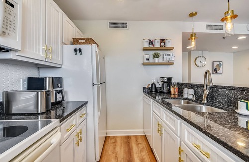 This condo houses a multipurpose kitchen that can cater for a full meal, whether you're seeking a laid-back breakfast, a lazy lunch, or a quiet night in. It features a beautiful tile backsplash, granite countertops, and a breakfast bar.