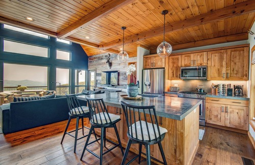 The cozy king master bedroom sits off of the living room with an en suite bathroom with tub and step-in shower. There is an additional full bathroom with step in shower on the main level. Located on the lower level are two bedrooms, one with a queen bed and the other with two sets of twin bunkbeds for the kids. Both bedrooms share a bathroom with tub/shower combo. The fourth bedroom is located on the upper level with a queen bed. This magnificent home sleeps up to eight people, perfect for a family get-together or friends' retreat. Visit the Blue Ridge and live the luxury mountain life at Owls Nest.