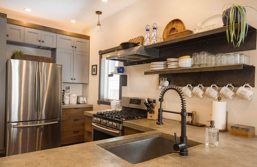 Big and bright studio with ample room to spread out! Curated layout and creative design elements combine to make this a wonderful place to unwind and explore. The kitchen is oversized for a studio and comes well stocked. The bathroom is luxuriously large with a walk in shower and high-end toiletries provided. There is bar seating at the kitchen island and a comfortable living room with a large TV for movie night. Enjoy coffee or cocktails from your idyllic front porch and watch the not-so-real-world go by!