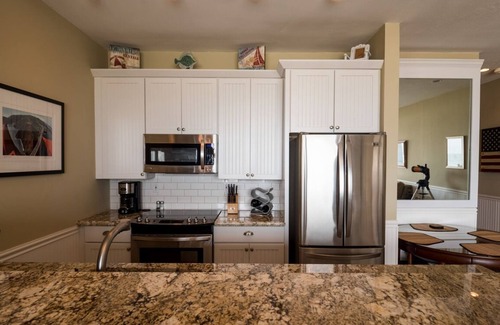 Fully equipped modern kitchen with granite counters, upgraded appliances and breakfast bar stools. Please note that all BBQ's in the Pelican condos have been removed due to HOA policy.