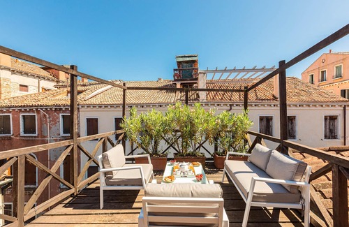 Inside, the apartment features three bedrooms and three bathrooms, with a central 'Salone' adorned with terrazzo flooring and a Murano chandelier. The sitting room offers canal views, while the compact kitchen is well-equipped for culinary endeavours. The master bedroom boasts canal vistas and an ensuite bathroom with a bathtub. A private staircase leads to a rooftop terrace, perfect for enjoying the Venetian sunshine. The third bedroom, accessible via the terrace, provides an intimate retreat with an ensuite bathroom.