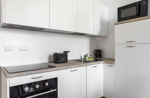 The refined open space of approximately 40 sq m has been furnished with elegant furniture, custom made by Italian artisans. The apartment opens onto the day area where a comfy double sofa bed (160x200) is located, in front of a small cabinet with a 32” Smart TV and WIFI connection which guests can use to access online services - such as Netflix - with their own account. The kitchen is fully equipped with an electric oven, dishwasher, refrigerator, microwave, toaster, electric kettle and induction hob. The dining table can accommodate up to 4 people.