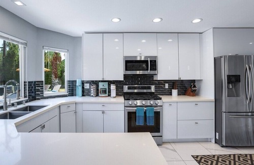The kitchen is completely updated with new finishes and stainless-steel appliances. You'll appreciate this fully stocked kitchen with all of its counter space and room for kitchen time as a group. This Palm Springs vacation home is sure to inspire vacation memories that will last a lifetime.