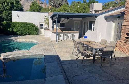 We have 60 five star reviews on another site. Our customer service is unparalleled. The home is located in the heart of Palm Springs! Close to dwntwn Palm Springs, local parks, shopping centers & yummy restaurants. 3 blocks from PS Convention Center. You will love this very private, large 4 bdrm family friendly home. Two master Bedrooms! Hardwood floors. French doors opening to pool frm living room & bedrooms! Lrge living & dining rm for family get-togethers. Large stocked kitchen. Steam shower in Master Bedroom. Jacuzzi is complimentary. Private pool. Pool heat is $100 a day extra. Mountain views from pool area. Fruit trees. Pool Bar. BBQ. Dog run. CITY ID 1391