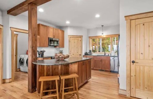 A laundry room with front-loading washer/dryer and provided detergent is right off the kitchen.