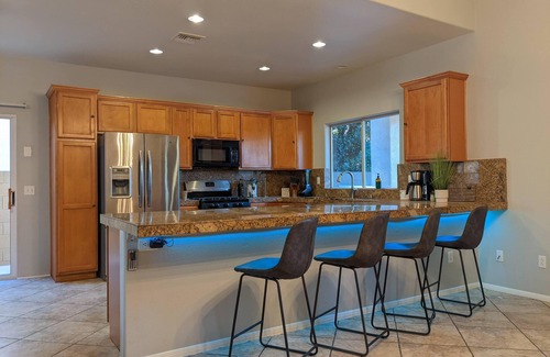Here's what you'll find at Sunset Springs: A huge back yard with private pool and hot tub, on the sunny side of the house for all day fun. canCorn hole set and lounge chairs ready for use! An enormous kitchen and dining room w/ granite bar big enough for your famous taco night (or just feast of delivered pizzas). The dining table seats 10 guests easily with a view of the pool. Or take the meal outside to the patio bar-and-grill, the "Cactus Club"! Featuring a huge gas BBQ, bar space, and cafe seating for your coffee or wine. We even have a pass-through window from the kitchen to the outdoor bar for truly indoor/outdoor living.