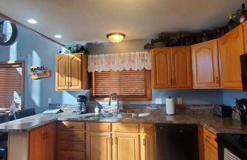 The Great room has a love-seat with center console and double recliners, and also a matching stationary recliner, coffee and end tables. 60" flat screen TV, Surround sound stereo/theater DVD system, free high speed fiber optic WiFi internet throughout house, Como connect satellite TV programming, and signal booster for Verizon cell phone users. Kitchen has stove, microwave, refrigerator with ice maker, dishwasher, coffee maker/filters, toaster, deep fryer, crock pot, and all the common utensils, dishes, pots and pans you should need. The kitchen is separated to the great room with a L shaped counter top, and bar stool seating for 2, next to the dining room that consists of table seating for 6. There is also a folding table and chairs for additional seating for larger groups. Outside the patio doors off the dining area is a large deck with new composite decking, Blackstone gas griddle, table seating and umbrella that overlooks the dock and lake.