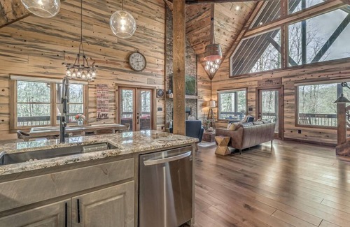 Enjoy cooking your meals in the fully stocked kitchen with just about every convenience for the chef including a waffle maker, rice cooker, air fryer, and fondue set. Custom cabinets, granite countertops, and stainless-steel appliances balance the modern and rustic atmosphere of the cabin.