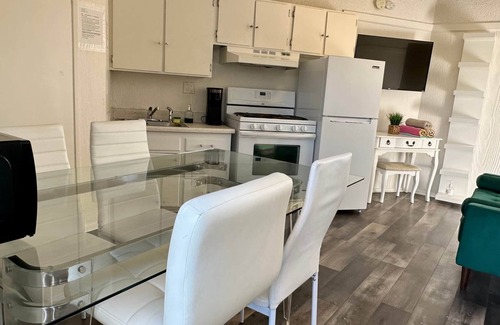 This listing if for Unit 5, located on the ground floor of our building; it comes with a private kitchen, bathroom, and patio (all pictured). The kitchen is equipped with a refrigerator, freezer, microwave, and coffee maker! The unit is also equipped with black out curtains, TV, and A/C and heating. The restroom comes with extra beach/pool towels, hair dryer, shampoo, conditioner, and shower gel. The hosts will be on or nearby the property (in another, distanced unit) in case guests need anything like additional linens, pillows, etc. Guests registered to stay in this room will have complete access to our other facilities, including the mineral hot tub, pool, and barbecue facilities.
