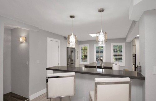 Two homes in one! You can bring the in-laws. This spacious townhouse features three levels, and can be enjoyed as two completely separate living spaces, each with their own private entrance and accommodations if so desired. Perfect privacy and space for in-laws, teenagers or several couples. Enter the foyer and walk up to the main level into the generously sized open floor plan. There you’ll find the living room with 82” flat screen TV and Sonos surround sound system, dining room with oversized table with seating for six, bar area, and a well-stocked Gourmet kitchen with a pantry, quartz island & counters, and a raised snack bar with more seating. The third floor features an expansive master bedroom ensuite with lots of natural light a king-size bed, flat screen TV and an open work area with a desk, chair, printer and wireless phone charger. The private luxurious master bath has a lavish, glassed double shower with dual shower heads and double sinks. The master suite also has access to the spiral staircase leading to the furnished rooftop deck to perhaps enjoy an evening of cocktails and star gazing. Down the hall, the guest bedroom has a queen-sized bed, twin bunk beds a flat screen TV, and includes a full ensuite bathroom. On the entry level, there is another living room with a flat screen TV, a leather chase lounge couch, an enhanced kitchenette with a toaster oven, convection/microwave oven, full-size refrigerator and a table and chairs. There’s also another full bathroom, a spacious bedroom with a King-size bed, flat screen TV, sitting area, and access to the large furnished patio adjoining a natural mangrove area. The private laundry room is accessed on the front porch and has a combo washer/dryer. This villa has it all and will provide for you the many well thought touches to enjoy a perfect get away.