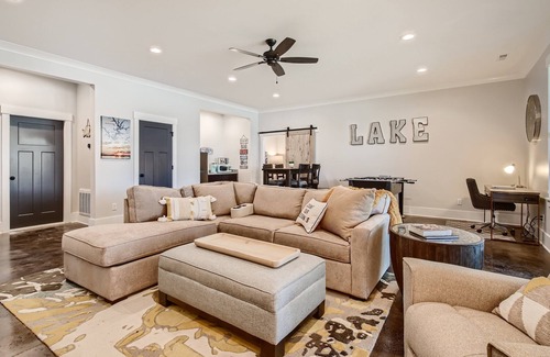 Outside you will also find a gas fireplace, fans, a water fountain, air cooler, ping pong table, corn hole, and games for kids and the young at heart. The property offers three large master bedrooms, two living rooms, a downstairs kitchenette, two kayaks, two paddleboards, a lake mat, foosball, and more. There is also a baby gate, booster chair, and pack-n-play for the young ones. Smart TVs are in every room with a blue ray player in the downstairs living area. There is a great DVD library on site. Enjoy the gourmet kitchen with high-end appliances as well as a center island with seating for four.