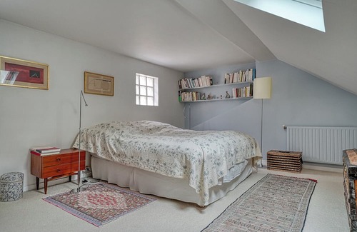 Moving upstairs, you'll find a cosy master bedroom with a double bed and a comfortable mattress for a peaceful night's sleep. There are shelves to store your belongings and a desk if you need to work during your stay.