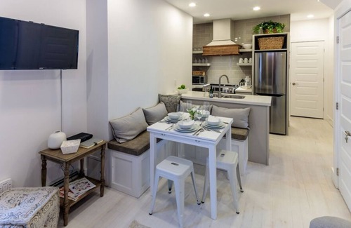 Feel instantly relaxed when you step through the doors into this cozy open concept flat. Combined living, dining and kitchen areas create an intimate stay. Modern banquet seating with extendable table and stools allow for a delicious home cooked meal or easy entertaining with friends and family. Quaint bedrooms with luxurious sheets, robes and slippers will make this stay downtown feel like a tranquil country getaway.