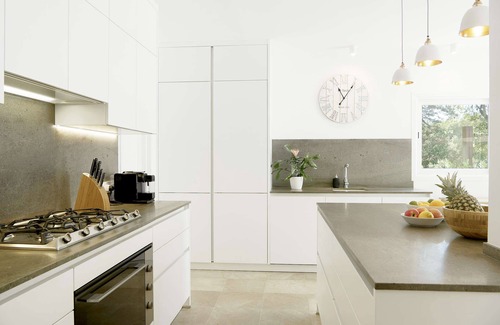 The villas open-plan lounge and dining area is bright and inviting, with modern furniture and large windows bringing in natural light. A well-equipped kitchen with a large island/breakfast bar, gas stove, oven, microwave, dishwasher, and fridge.The kitchen is ideal for preparing meals, and the solid wood dining table comfortably seats 10 for family meals.