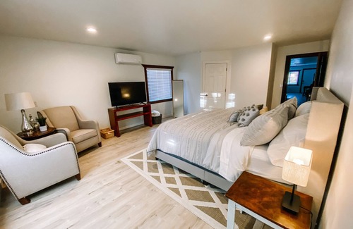 Primary Suite with King Bed and exterior door and walk-in closet with beautiful view of the Sawtooth mountains. Second bedroom with queen bed and closet. A roll away twin bed available with total accommodations for 5 guests.