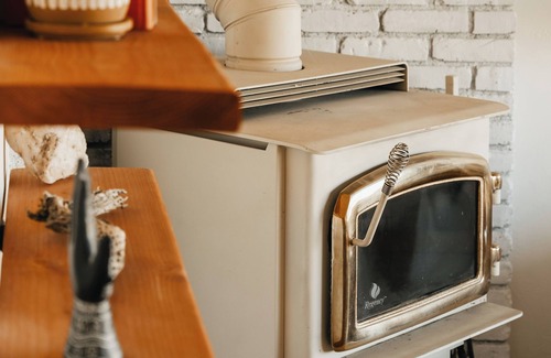 You’ll enter the home into a large living room with a wood stove to keep you toasty warm on cold desert nights and risings. You may notice there is no TV... in its place, we encourage a bit of conscious reading (you'll find several of our favorite books about the house), or gathering around the record player or trying your hand at tickling the keys of the vintage Story & Clark piano in the lounge.