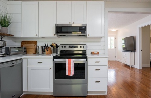 Retreat to the porch of Peaceful Pines Cottage and gaze at the stars in Black Mountain from the comfort of your rocking chair. Located a short walk to the Village of Cheshire, 1.5 miles to historic, downtown Black Mountain, and 20 minutes to Asheville, this cozy cottage is the perfect getaway for those seeking a quiet and relaxing home from which to explore the entire Blue Ridge Mountain area. The fully remodeled cottage offers king and queen beds, blackout window shades in the king bedroom, portable fans, extra pillows and comforters in each room, a well-appointed kitchen including microwave, stove, blender, popcorn popper, toaster oven, coffee maker, and water boiler, a washer and drier, an on demand hot water, a responsive heating and AC system, a dining table with chairs, an L-shaped white leather couch, Samsung Smart TV with a sound bar and subwoofer. Outdoor Adirondack chairs where you can enjoy the beautiful, tree-filled garden full of birds and wildlife, and rocking chairs on the front porch from which you can enjoy sunset happy hours with mountain views. Since Asheville is so close, Peaceful Pines Cottage offers an escape from the bustle and excitement of the city. Soak in the silence, listen to the birds, and rest peacefully before heading back out into the mountains or city for more adventure. From your doorstep you can walk to the historic former home of Rafael Guastavino's Rhododendron Estate adjacent to the Christmount Retreat Center, hike along nature trails, or ramble along a neighborhood route to the charming Village of Cheshire with its restaurants, shops, and pubs. The town of Black Mountain is a Buncombe County gem with so many incredible restaurants and breweries that you may never drive to Asheville! Some of our favorites include: Goldfinch, Cuban Cousins, Pure & Proper, Black Mountain Brewing, Fresh Pizza, La Guinguette, Trailhead, Dripolator, The Railyard, Olé Guacamole's, Taco Billy and so many more. Shop for antiques on Cherry Street, visit the Old Depot Arts & Crafts Center, explore the arts and crafts at the Seven Sisters Gallery, check out the art exhibits at the Black Mountain Center for the Arts and the Red House Studios and Gallery, listen to live music at the White Horse Black Mountain and The Railyard, and learn about the regional history at the Swannanoa Valley Museum & History Center located downtown in a converted 1921 firehouse. Down the road toward Asheville, stop in at Pisgah Brewing Company, Black Mountain Cider & Mead, and the Oak and Grist Distilling Company. There's so much to see and do! We hope you love your stay as much as we always love staying here. Discover the beauty and diversity of Black Mountain and the dynamism of Asheville during your stay at Peaceful Pines Cottage.