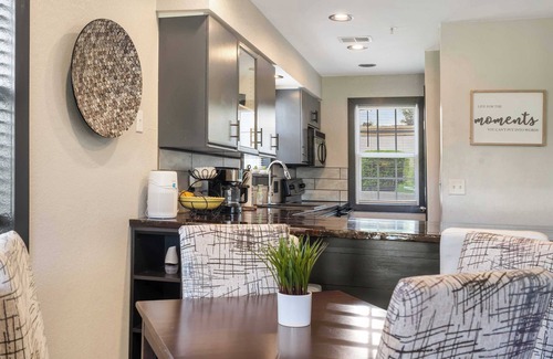 As you step inside the warm, inviting living space, drop your bags and sink into the cozy sofa or recliner for an afternoon nap or to wind down with your favorite show streaming on the smart TV. Natural light floods the space through sliding glass doors that lead to a private balcony with seating. From here, you'll enjoy tranquil tree-top views, making it the ideal spot for a quiet morning coffee or a glass of wine at sunset. The open-concept kitchen invites you to linger with its rich wood countertops, sleek appliances, and everything you need to cook up your favorite meals. Brew a fresh cup of coffee from the drip coffee maker while chatting with guests seated at the counter for two, then serve up dinner at the nearby dining table with space for four. Whether you’re cooking a full meal or just prepping snacks for a day on the go, this kitchen is both functional and inviting.