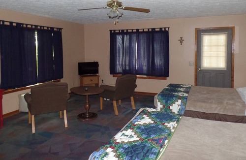 Located 200 feet above the Ohio River, your room's back porch offers one of the most scenic vistas in Southern Illinois. Just 12 miles from "Garden of the Gods" recreation area and many National Forest hiking trails. Guests can explore the 200 acres of peaceful retreat while walking the nature trails located on our property. A firepit and wood are readily accessible by the large picnic area along the river bluff. Your room includes a kitchen, fireplace, in bath jacuzzi tub, 2 Queen beds and enough room for 4 people.