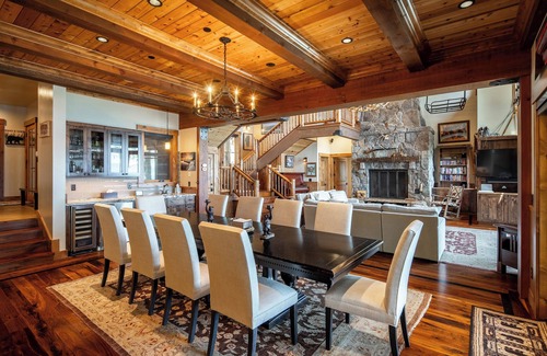 The lodge-style house features a rugged architectural design that’s perfect for those who love the great outdoors. The granite rock fireplace, wooden floors and beams, large windows, and rustic décor evoke the best of life in the High Sierras.