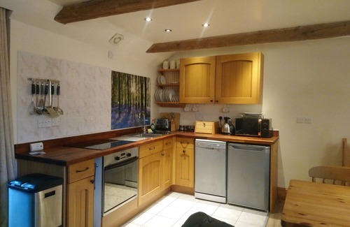 A warm welcome awaits. Open the front door to your delightful rural retreat where you can unwind and relax .The Barn has a large open plan very well equipped kitchen to create a home from home feel, Double air fryer, dishwasher cooker, microwave, hob, kettle, toaster, all crockery, cutlery, glasses, utensils, tea towels , fridge with freezer box. A large chest freezer and washing machine are available in the shared utility room on site.