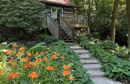 The cottage on Payne Branch sits above the road with a charming perennial garden that leads you up to the antique log cabin. A stream tumbles down the mountain beside the house; it's something from a fairytale. Payne Branch cottage has two bedrooms and a full bath, its cozy décor invites you to snuggle under a blanket in front of the fire and relax. A full kitchen and ample dining room round out the floor plan. Hand-hewn logs adorn the walls. The surrounding deck space is sunny and is situated adjacent to a stream that provides the sweet sounds of water tumbling down the mountainside. Tastefully decorated, the cabin is ready for your enjoyment. Situated between Boone and Blowing Rock, the cabin is convenient to Appalachian Ski Mountain, Tweetsie Railroad and the Blue Ridge Parkway. A short stroll from your front door is the trail system for The Cone Manor and Trout Lake.