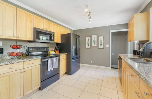 • has a coffee maker, dishwasher, microwave, stove, and oven