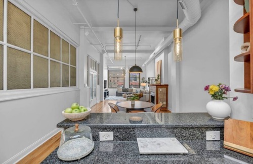 A delightful surprise awaits atop this loft: a rooftop deck where guests can gather for games and enjoy breathtaking views of the city skyline. Get ready for some friendly competition in rooftop cornhole! Bistro lights set the mood, casting a warm glow that enhances the magnificent atmosphere as you relax on the comfortable chairs after a day of adventure.