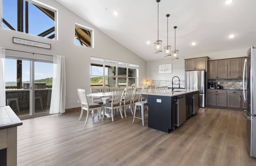 Ridgeview Retreat in Crown View Resort is the perfect vacation rental for family and friends! The main level of the house features three bedrooms, a spacious living area with comfortable couches and swivel chairs for viewing the lake, as well as a large fireplace. The open kitchen includes plenty of counter space and big windows with stunning lake views. Enjoy a delicious meal at the 14-foot dining table, perfect for large gatherings, or have a quick breakfast at the bar seating. From the back deck, you can overlook Table Rock Lake while relaxing on the patio furniture or grilling up some delicious food.