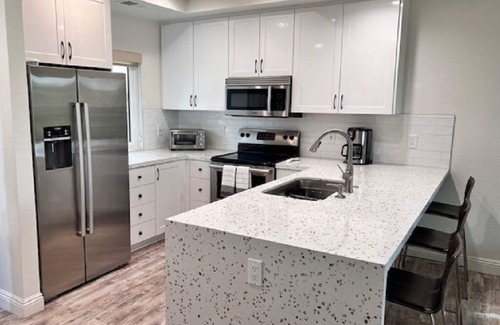Resort style vacation rental located in the Desert Princess Country Club. Located 3 miles from Palm Springs.Updated and spacious 1 bedroom 2 FULL bath. 2 flat screen TV's Cable/ HI SPEED WiFi. Washer /Dryer. Spacious patio with large BBQ and seating for 4.