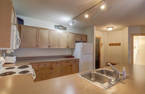 The kitchen is fully stocked with everything you need. The dining room table seats 6 people, and there are 3 additional seats at the breakfast bar. Two large hot tubs and a sauna are available to soothe tired muscles. Individual ski lockers are located by the front doors, so there is no need to carry skis and snowboards back and forth to your room. Park in the secure heated underground garage and take the elevator up to your second-floor condo. The clearance of the garage is 7'4". Overflow parking is available in the North Alpine Lot for an additional charge during the winter; summer parking is free. Laundry facilities are located on both the first and fourth floors.