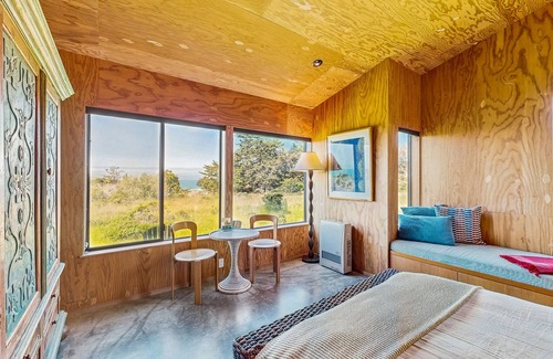 This adorable beachfront studio is the perfect way to celebrate your next vacation to sunny Sea Ranch! Every grain of the all-wood interior is brought out by the cascades of natural light coming in through the ocean-view windows, and the antique cabinets, vaulted ceiling, and attractive decor helps to provide a welcoming ambiance throughout. You'll love waking up to the toasty aromas of freshly-brewed coffee and taking leisurely strolls along the redwood trees and coastal foliage lining the ridge to catch glimpses of the deer, fox, and rabbits roaming about the yard. Spend the day at the beach then come home to stream your favorite Netflix movies on your laptop. Later, spread out a blanket or two to enjoy an evening of peaceful stargazing while the ocean surf rolls in below. You can even challenge a friend to a few games on the shared basketball and tennis courts.