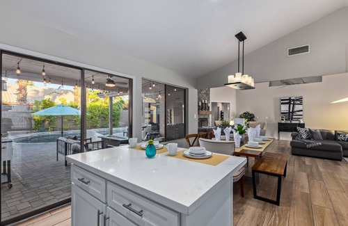 Fully updated and upgraded Scottsdale home with everything you need! This 3 bedroom 2 bath offers an outdoor living space, a sparkling heated pool, a putting green, 2 electric fireplaces, and so much more. The master bedroom is equipped with a king size bed, TV, Fireplace, and a door taking you out to the oasis of a backyard. The master bathroom has double sinks, a beautiful walk in shower, and a spacious walk in closet. The first guest bedroom offers two twin beds with a TV and the other guest bedroom offers a queen size bed and TV as well. The split floor plan allows all guests to have a place to retreat to at the end of the day while providing an open living space that everyone can enjoy together. Enjoy the queen sofa bed for extra sleeping in the living room.