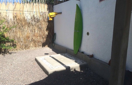 We wanted to create a space where our guests could feel at home and enjoy the comforts of home. All rooms come equipped with very comfortable beds, linens and towels. The property has many areas for you to explore. Take some sun on our oversized sun beds, kick back on our giant sofa bed, exercise in the outdoor gym, jump into the pool and after you sweat or surf, enjoy a cold shower in the outdoor shower, and at night curl up around the fire pit and share stories with your new friends. We also have some extra beach goodies for your use as our guests: sun umbrellas, cooler bags, and a 8ft foam surf board.