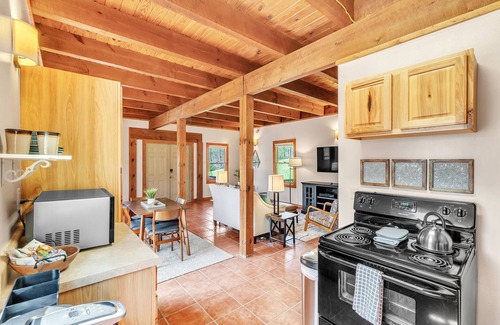 Our open living space includes a dining space, fully-stocked kitchen, and living area. The dining space includes seating for 6, and our functional standalone gas fireplace is both charming and useful for additional heating.