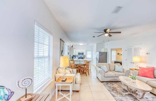This 3-bedroom, 2-bath townhome comfortably accommodates 6 guests, ensuring a trip full of cherished memories. The open-concept design features a spacious living area with tasteful decor, plush furnishings, and a fully equipped kitchen. Enjoy meals together at the family-sized table, and stream movies on the flat-screen TV for a cozy night in. The large porch outside offers a cool, shaded space to relax after a day in the sun.