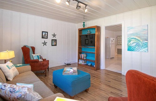 Located just a few blocks north of the beach and minutes from Downtown Bay St. Louis, the Beach, Fishing, Kayaking, Dining, Entertainment & More, Sea Starr Coastal Cottage offers 2 bedrooms, one bathroom, a screened in porch, a large fenced in backyard, and plenty of parking. Our cottage boasts a unique coastal flair with most of our decor created and handmade by our owner, herself! Guest Bedroom One offers a queen size bed, dresser, nice sized closet, and a Roku Smart Tv. The Bunk Room offers a twin over full set of bunk beds with built in stairs and dresser, a nice sized closet, and a Roku Smart Tv. A large, flat-screen Roku Smart TV, a couch that holds a full size sleeper sofa, 2 chairs for extra seating, plus an ottoman, can be found in our Living Room. Our open and spacious kitchen and dining areas offer a unique, one of a kind, coffee bar area with a coffee grinder, a large dining room table that seats 5 comfortably, frosted beer mugs awaiting your favorite beverage in our freezer, plus all of the comforts of home in the event that you decide to stay in and cook. Directly off of the kitchen is our amazing, screened in, porch area that offers seating for you to sip your morning coffee or to just relax and enjoy the coastal breeze! Our laundry room offers a full size washer and dryer for your convenience as well. Sea Starr Coastal Cottage is family-friendly and can accommodate up to 6 people comfortably.