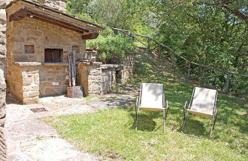 Quaint stone house in quiet hillside location, surrounded by vast forests. Rustic furnishings. In front of the kitchen-living room with open fireplace is a romantic sitting area with barbecue and pizza oven. A little bit below on the property the installed pool invites to refreshment. All around only forests - here you are really all to yourself: ideal for relaxing, hiking and browsing. As excursion destinations you can visit Lake Trasimeno with its sandy beaches (35 km), Arezzo (30 km), Montepulciano (45 km), Città di Castello (35 km), Castiglion Fiorentino with stores of all kinds, restaurants and colorful weekly market 18 km, Cortona 25 km. The access road (4.3 km) is not asphalted, partly bumpy, steep, winding and therefore suitable only for 4x4 vehicles. Air conditioning in the bedrooms.