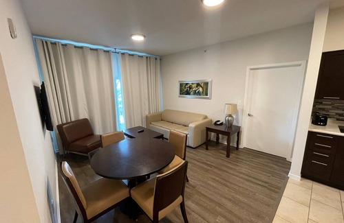 Featuring a layout and profile just like an apartment, our unit comes fully furnished with TVs and cable channels. We provide an initial set of linen, towels, and pool towels for up to 6 guests, but please note that daily service is not included in the rate. However, our guest self-laundry on the second floor is card-operated, with $3 for each load of washing or drying items.