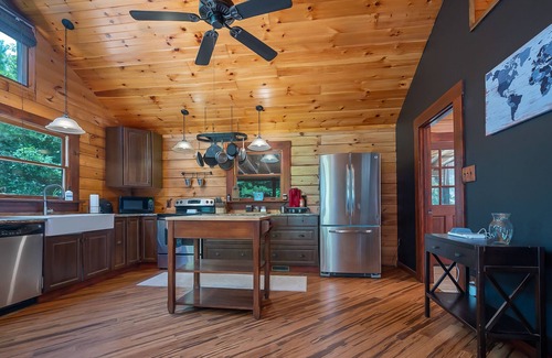 From the parking area you'll enter the front of the home from the wrap around deck, through French doors into the well-appointed great room (living area/kitchen/dining area). The fully equipped kitchen is stocked with everything you will need to prepare your meals, including a few extras. There is seating for 8 in the dining area that adjoins the kitchen. Just off the dining area is the cozy living room complete with a 65" flat screen TV, an Xbox XS w/Game Pass, and a wood burning stove for those extra chilly nights (homeowner provides wood for guest's use). There is a large laundry room with a washer and dryer right off the kitchen, which then leads out to a fully furnished screened porch perfect for your morning coffee or an after-dinner glass of wine. A charcoal grill sits just outside the screened porch for easy access to the kitchen. A lovely fire pit and outdoor sitting area completes the back yard.