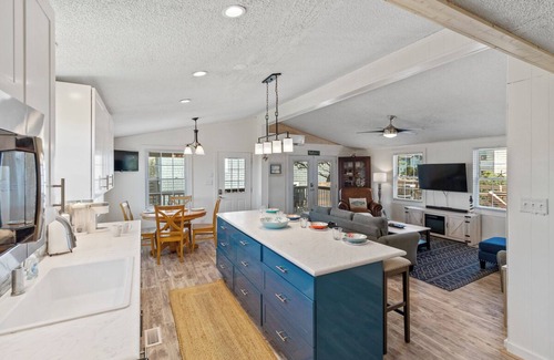 Step inside to coastal charm. Your chef will love the spacious, well-equipped kitchen, with a large island, stainless steel appliances and plenty of cupboard space. The comfortable living area is perfect for family entertainment with plenty of seating, streaming TV, and an electric fireplace for those rare chilly evenings. At the end of your fun-in-the-sun day, choose from two queen bedrooms that share a hall bath, or a king en suite with a stand-up shower (no tub).