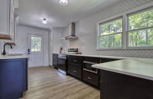 As you step inside, you are greeted by a bright, airy, fully stocked kitchen and living area with large windows that let in plenty of natural light. The kitchen is equipped with stainless steel appliances, quartz countertops, and custom cabinets. The adjacent dining room is perfect for hosting intimate dinner parties or family gatherings. The kitchen flows seamlessly into the living room, which is spacious enough for watching tv or playing games with everyone in your group.