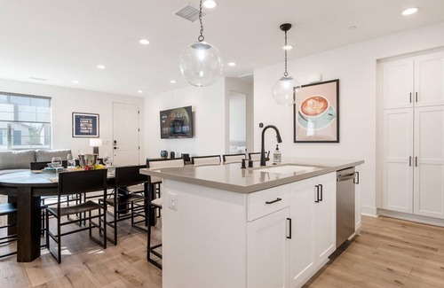 Be one of the first guests at this recently built Signature Jewel two bedroom condo in the heart of PGA West. The two story unit features an open-floor plan, a modern kitchen and a two car garage providing all the comforts of home. Guests enter through either the front door or garage from a shared driveway. The spacious living/dining area sits on the south end of the condo with the primary bedroom on the same side. The living area has a queen sleeper sofa, chairs and a wall-mounted Smart TV. It flows into the kitchen with a dining table seating four in between. The kitchen has every major appliance including a gas stove/oven, refrigerator/freezer, dishwasher and built-in microwave. Ample cookware and dinnerware are available for meal preparation and service. The primary bedroom provides a private oasis to enjoy your desert stay. A king bed, smart TV and ample closet and storage space are just a few of the creature comforts. An en-suite bathroom has a large double vanity, a walk-in shower and toilet. On the north side of the condo, a guest bedroom with a queen bed and smart TV sits down the hall from the bathroom. There are a full size washer and dryer in room at the end of the hallway and the laundry room opens to a 2 car garage. A private patio with a BBQ grill and outdoor seating is surrounded by a private yard on the north side of the condo. On the second level a beautiful spacious loft that has has a queen sleeper sofa and a wall-mounted Smart TV, along with a spacious working desk. Second floor loft can serve as a second living room or office space.